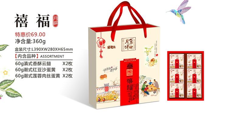 喜悦月饼-禧福礼盒装潮式香酥云腿 红豆沙蛋黄 莲蓉肉丝蛋黄混装 团购
